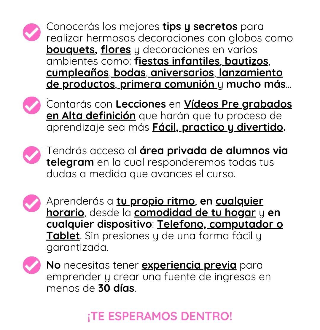 Tu éxito está a solo un paso de distancia.No pierdas la oportunidad de llevarte estos regalos y el descuento especial, y así poder añadir una nueva habilidad a tu lista y convertirte en un decorador de fiestas envidiable. ¡Inscríbete ahora en nuestro curso de decoración con globos! |